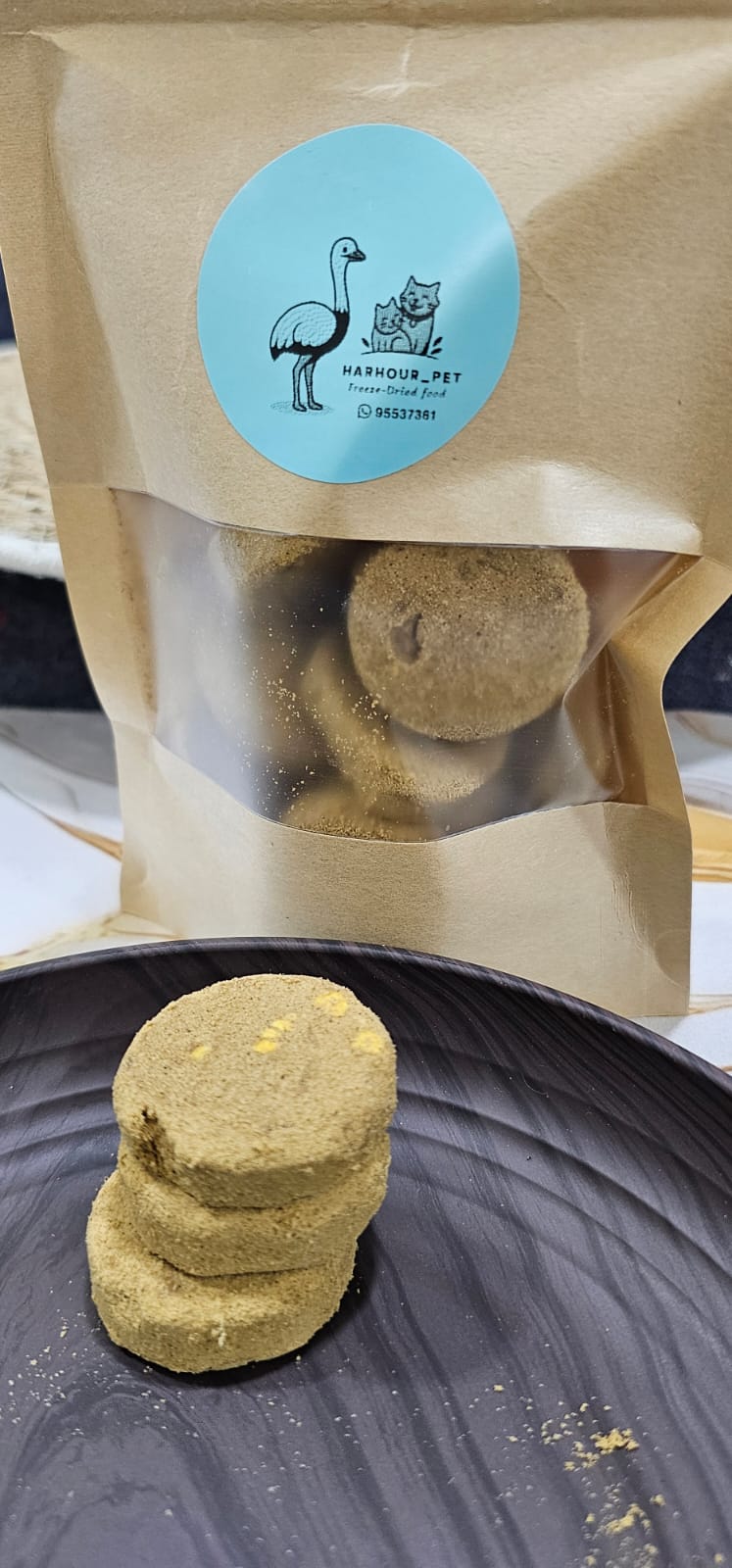 اتيه لحم النعام المجفف بالتجميد مصنوع من لحم النعام الطري، صفار البيض، القلوب والقوانص، مع الحفاظ على قيمته الغذائية الطبيعية.